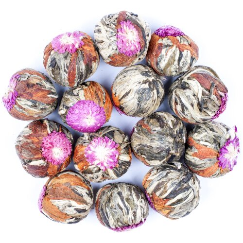 Początkowo skromna kula białej herbaty, po zetknięciu z gorącą wodą, budzi się do życia, rozwijając piękny kwiat o amarantowo-pomarańczowym kolorze. Jego rozwinięcie jest niczym spektakularna koronacja, gdzie herbata ujawnia swoją prawdziwą naturę i urok.