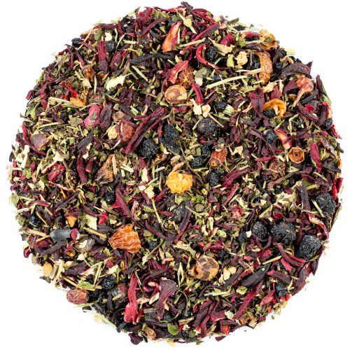 W składzie znajdują się dobroczynne i pyszne dodatki, owoce i zioła: hibiskus, skórka róży, aronia, liść melisy, głóg, czarny bez, skrzyp, liść lipy. Sama natura!